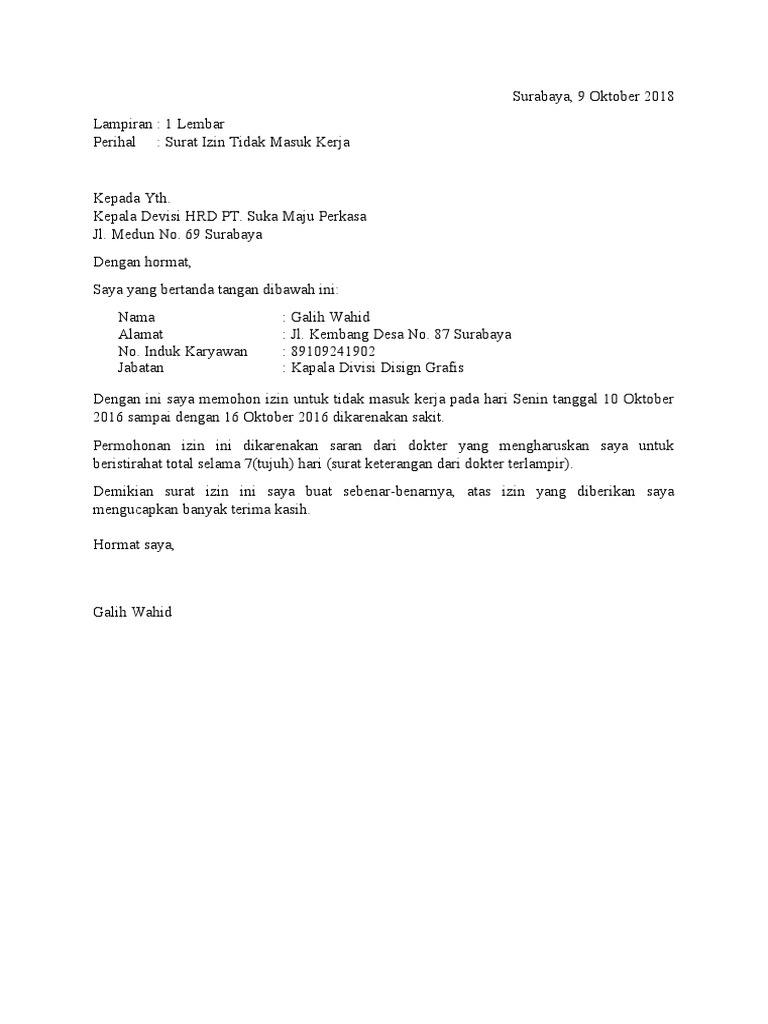 1. Contoh Surat Izin Sakit Kerja Bahasa Indonesia